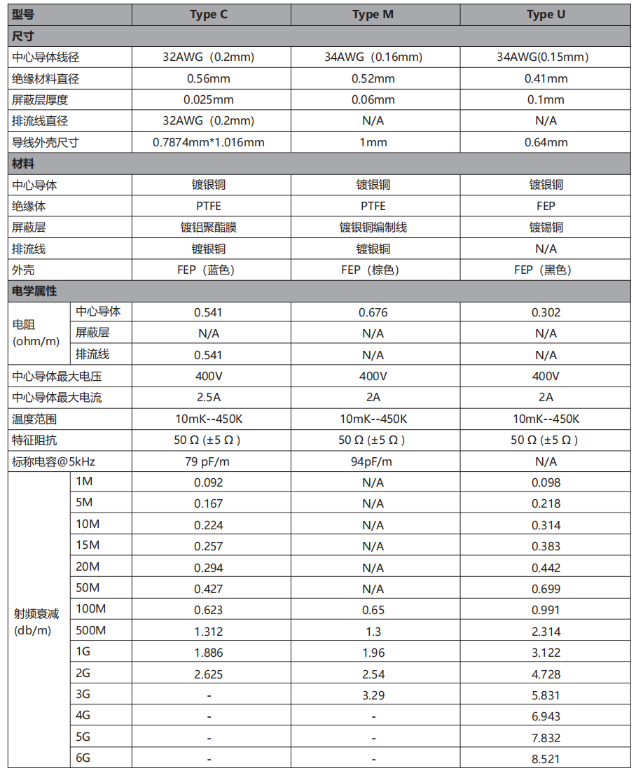 低温下使用的同轴电缆,除了电缆的电学性能外,还要考虑电缆的耐低温性能、真空兼容性、漏热、柔性、空间局限性等,特氟龙材料在低温下保持良好的柔性和真空兼容性,因此绝缘材料使用特氟龙的极细同轴电缆被广泛的使用在低温下进行精密的直流或低频测量