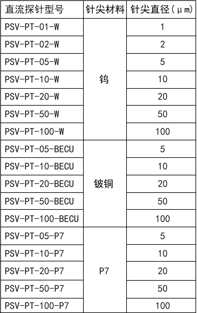 上海在线博彩平台为用户提供直流或GSG微波探针。直流探针有钨、铍铜和P7三种材质,其中钨探针更耐用,适合各种不同的接触面,硬度好,能刺穿氧化层;铍铜探针接触电阻更小,适用于和镀金电极的接触,P7材料最软,适用于电极厚度比较薄的样品。GSG微波探针有40GHz、67GHz和110GHz三种频率以及多种间距可供选择。