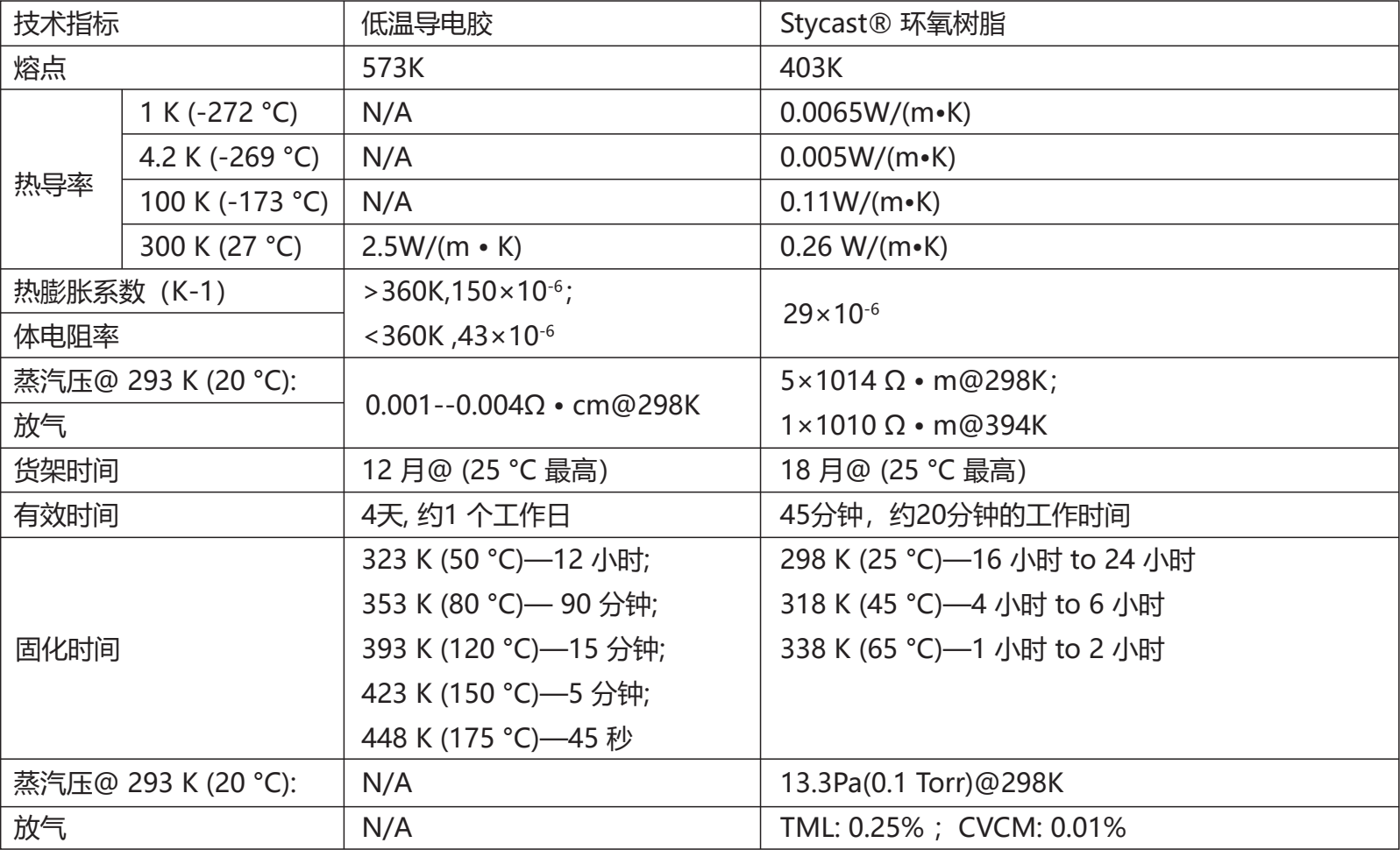 有低温导电胶和Stycast®2850FT环氧树脂两种。环氧树脂用于安装和固定传感器,同时提供与样品的热接触和电绝缘。环氧树脂也可用于机械附件和机械连接点的粘合固定。Stycast®2850FT是一种黑色环氧树脂,具有与铜匹配的热膨胀系数。银填充的低温导电环氧树脂具有优异的强度、导电性和导热性。