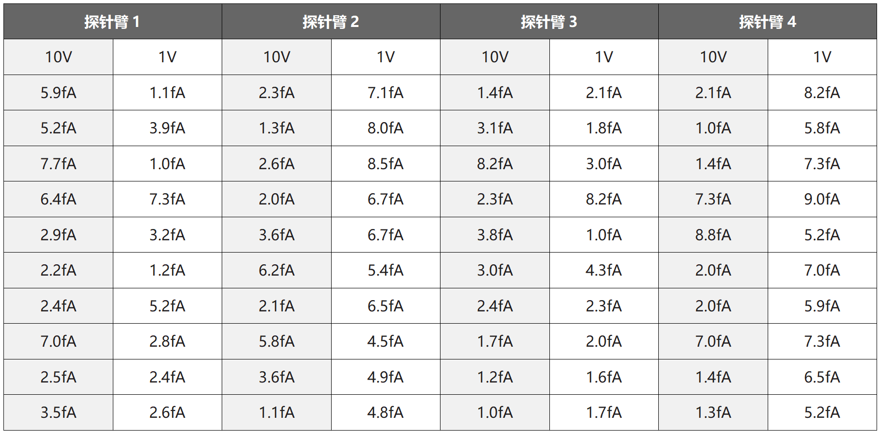 • 探针臂采用三同轴接头,漏电性能好,实测漏电流小于100fA @1V@80K--800K;