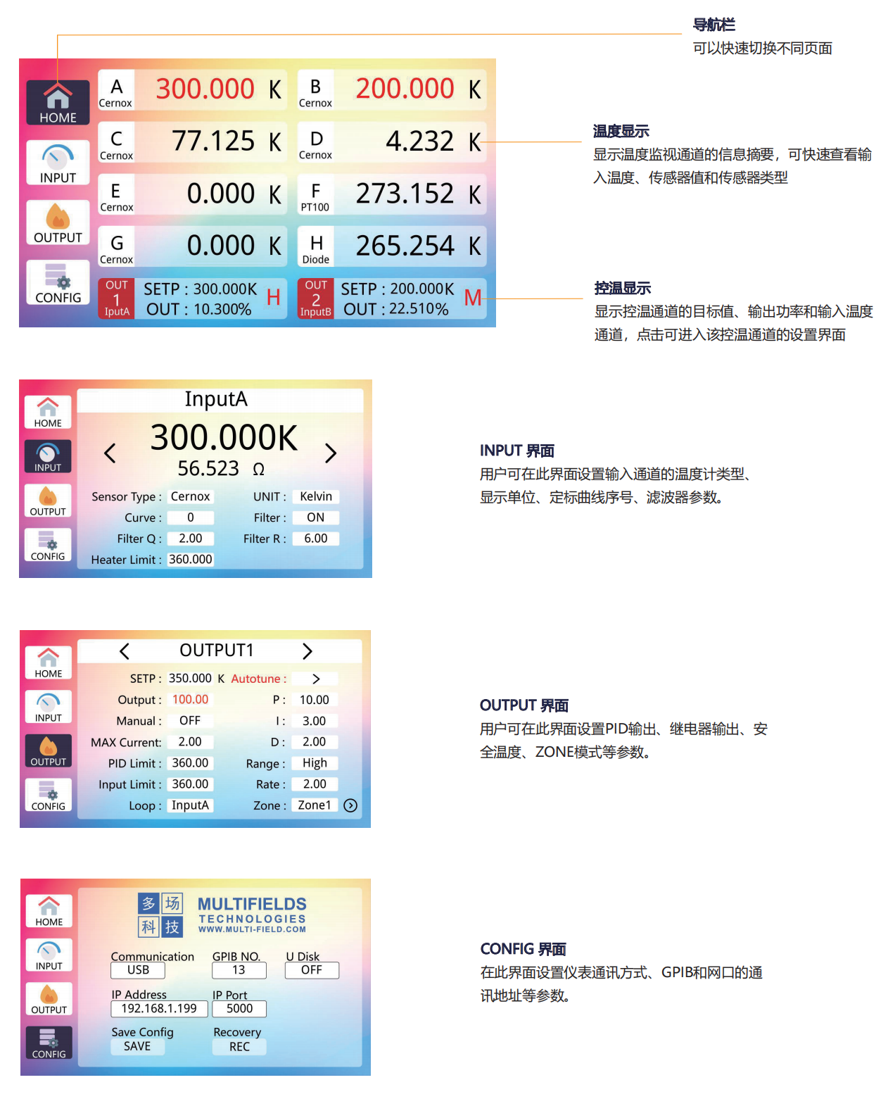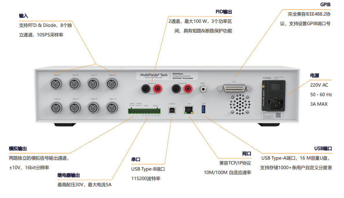 Kelvinion是⼀款功能强大的低温温控仪。它包括⼋路独立的高精度温度测量通道(支持RTD和Diode类型温度计)和两路高达100W+50W的大功率PID输出通道,以及两个继电器输出和两个模拟输出通道。PID闭环控制、Zone模式、变温速率设定和主动过热检测等实用功能的加持让Kelvinion低温温控仪成为低温研究的利器。