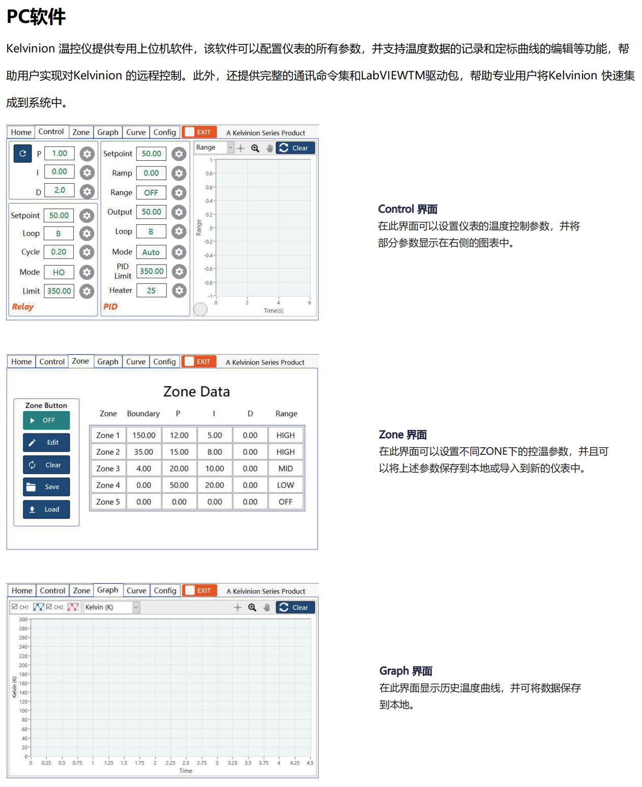 | Zone模式 | 5个温度区间可独⽴设置PID和功率量程 | ||||||||