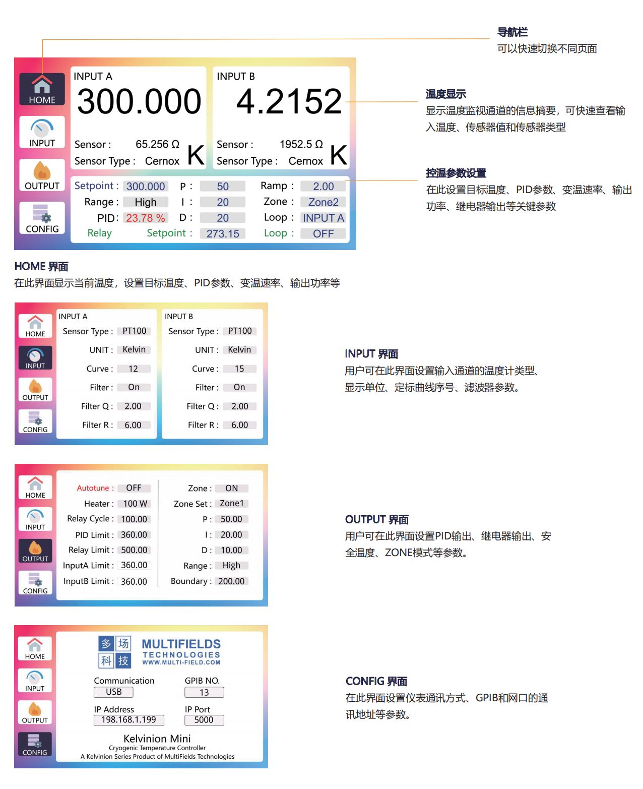 - 温度测量和控制可低至300 mK;