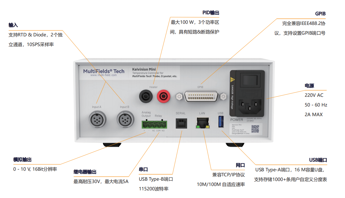 Kelvinion 2通道温控仪是⼀款设计紧凑的低温温控仪。它包括两路独⽴的⾼精度温度测量通道和⼀路⾼达100W的⼤功率PID输出通道,以及⼀个继电器输出和⼀个模拟输出通道。PID闭环控制、Zone模式、变温速率设定和主动过热检测等实⽤功能的加持让Kelvinion 2通道低温温控仪成为低温研究的利器。